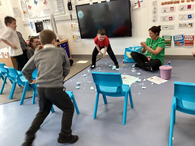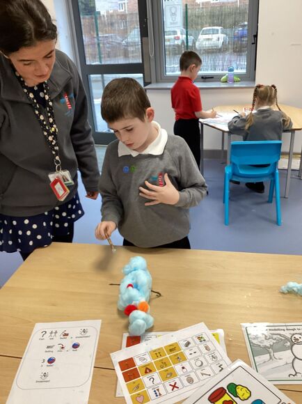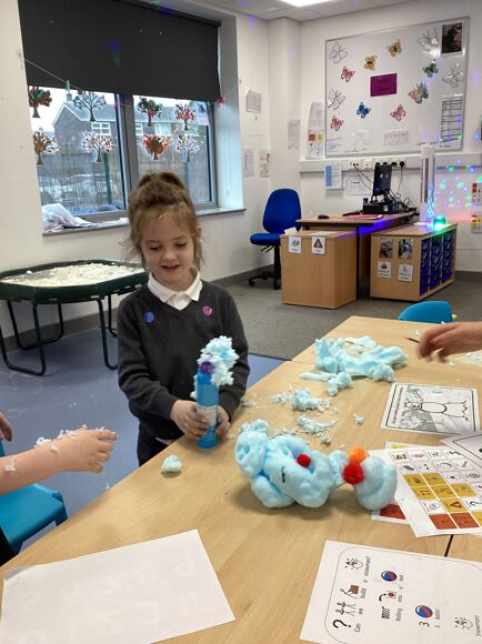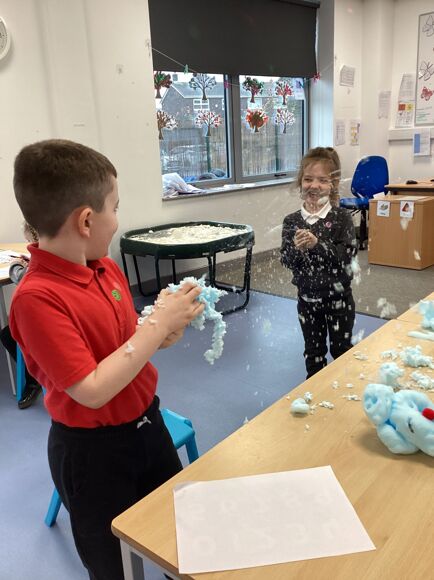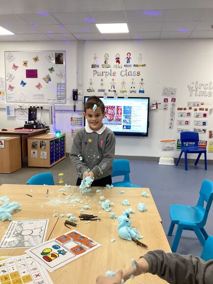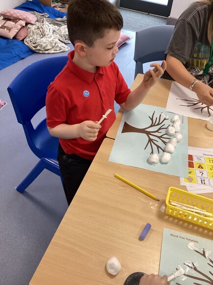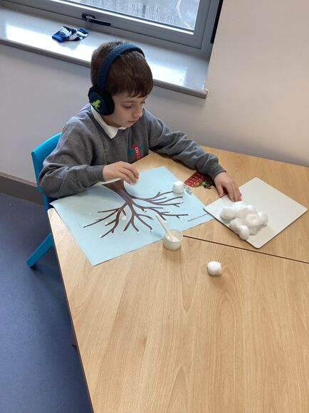 We have been learning all about Winter and what we can do, including ice skating, sledging and making snowmen! We know that we need to wear our big coats and our wellies so we can be all nice and warm when it is snowing. We even made a "snow tree" and realised there were no leaves on the branches, it was all snow! Fantastic work Purple Class!