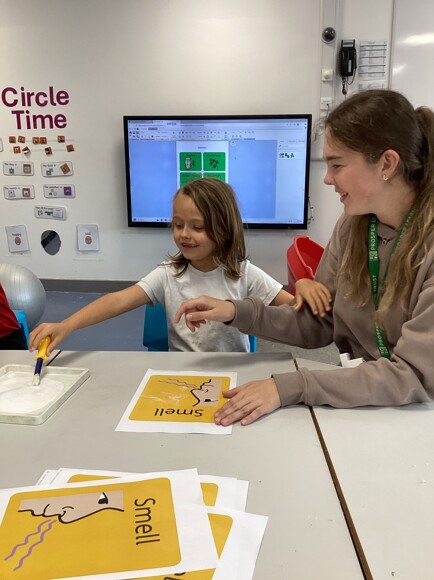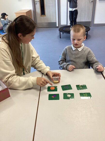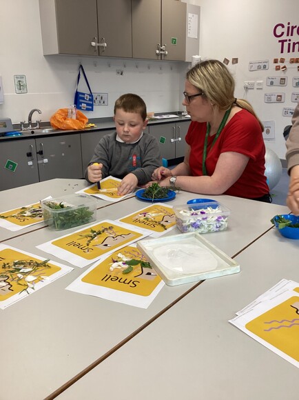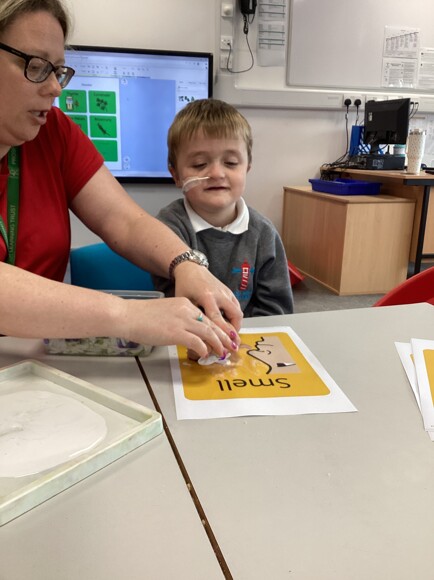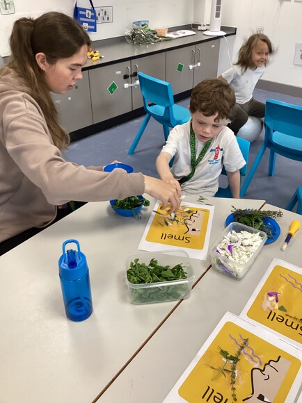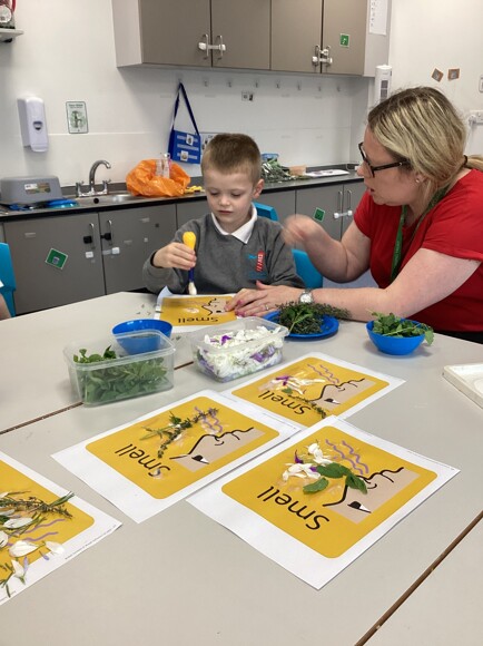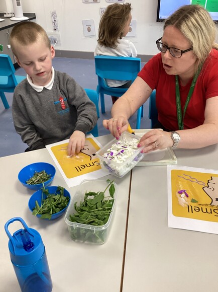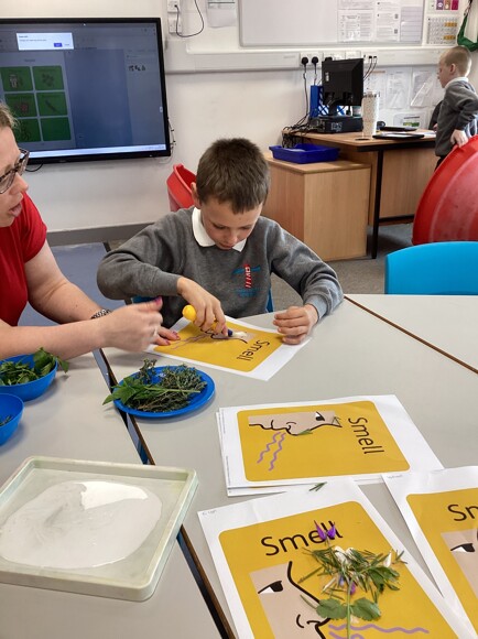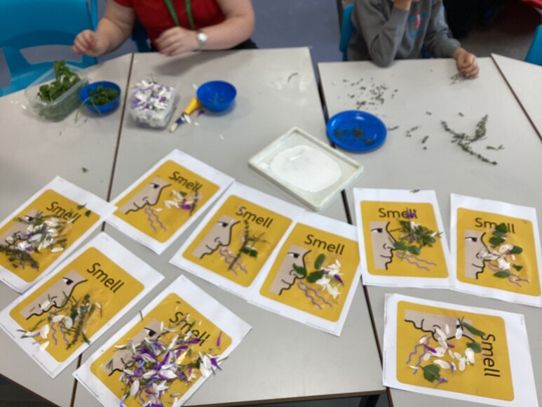 This week in Purple Class, they have been using their sense of smell to explore different items. The pupils have enjoyed smelling different pots with various scents in them, and created a picture with items that they can smell.