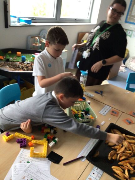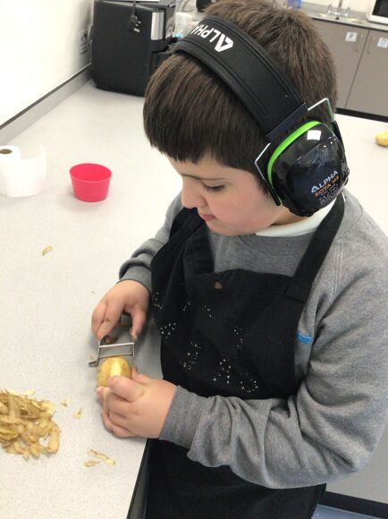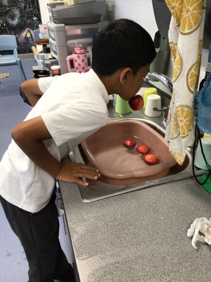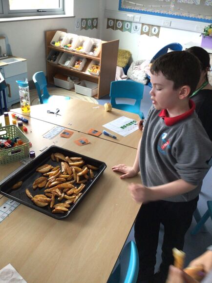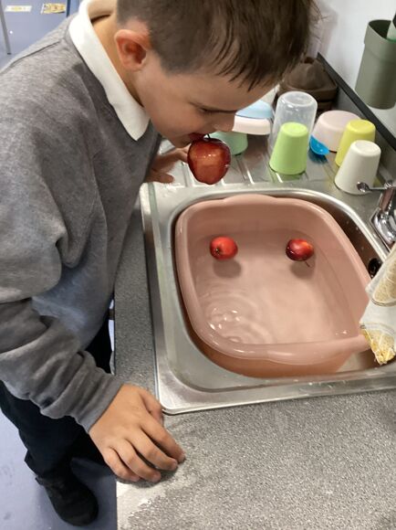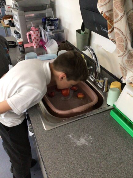 They put this into practice and peeled some potatoes before an adult chopped them to make potato wedges; they were so yummy. They linked this with their Enrichment topic last week, which was all about the Harvest Festival. There, they did some apple bobbing and role-played milking cows.