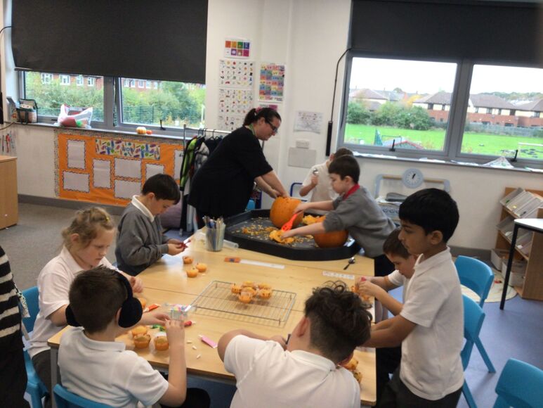 Then, they baked and decorated some delicious pumpkin cakes, before helping with pumpkin carving!