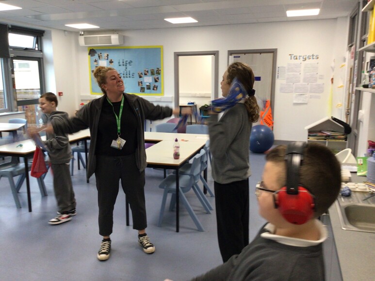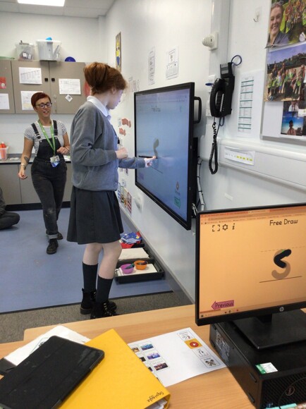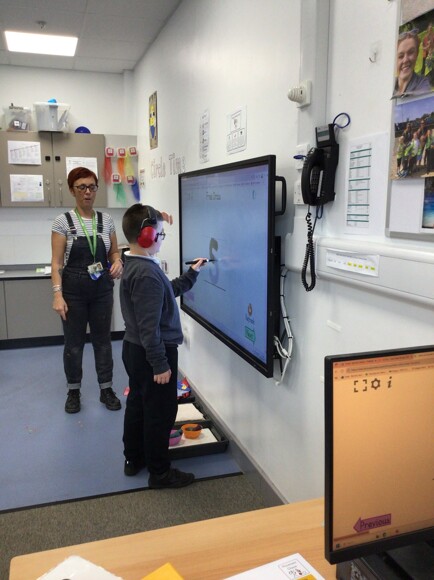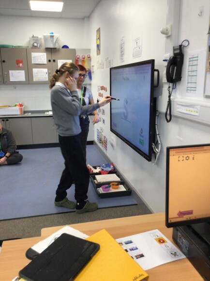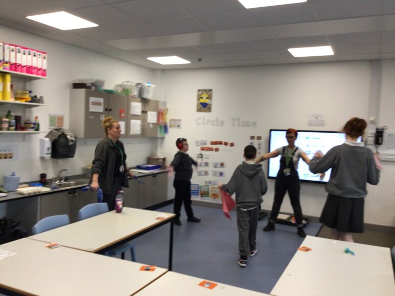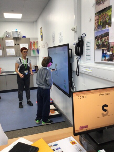 The pupils all enjoy using their movement with their flappers to warm up and then use their magic finger to make the letter shape in the air. They get to take turns practising their letter formation on the interactive board. Then, they moved on to forming the letter on some carpet and finally used a pen and a whiteboard.