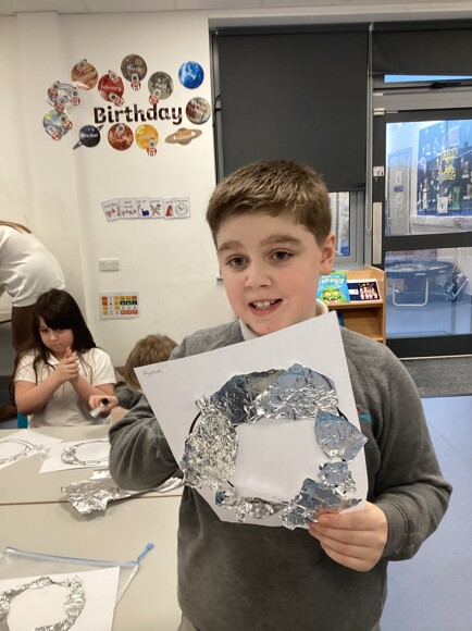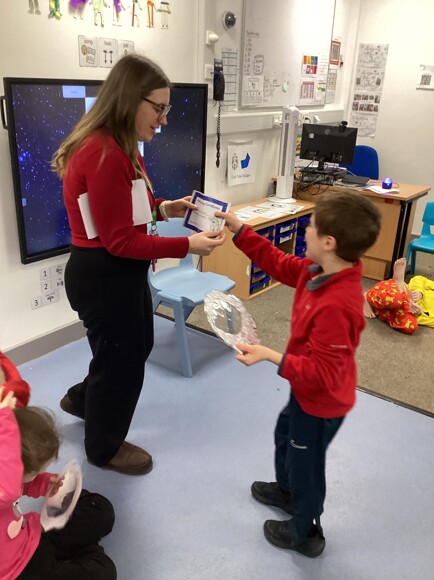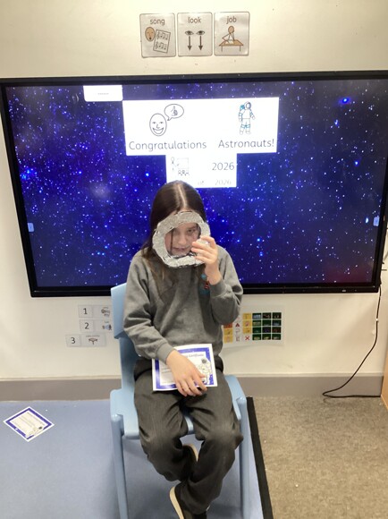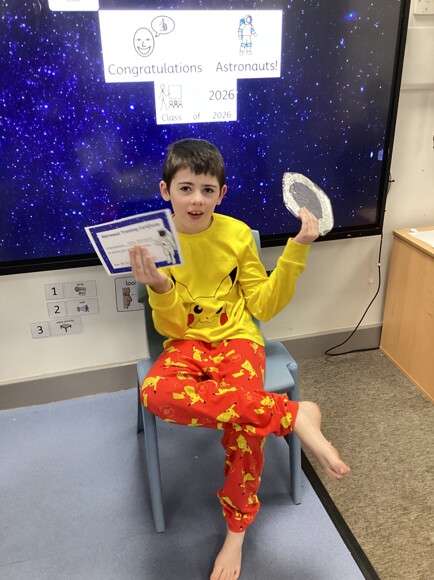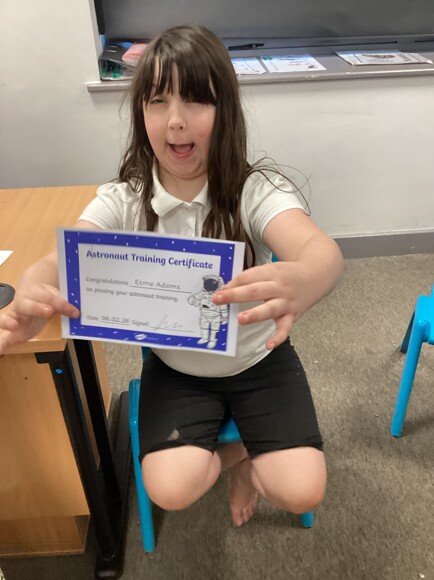 Pink Class then set up their own space test centre to become astronauts. The pupils had to hop on meteorites and refuel the rocket ship. Then, they had a celebration and received their astronaut helmet and certificate.